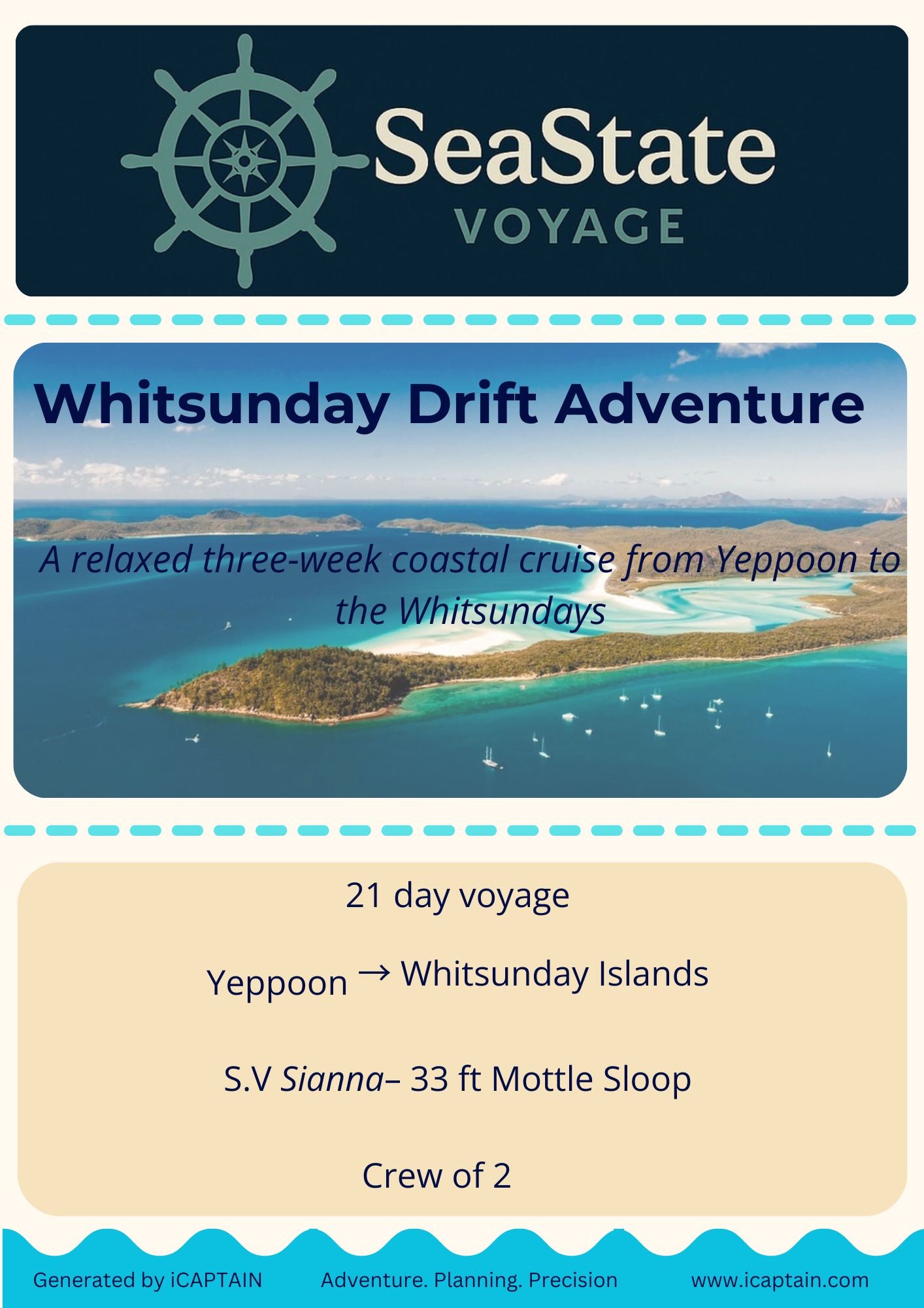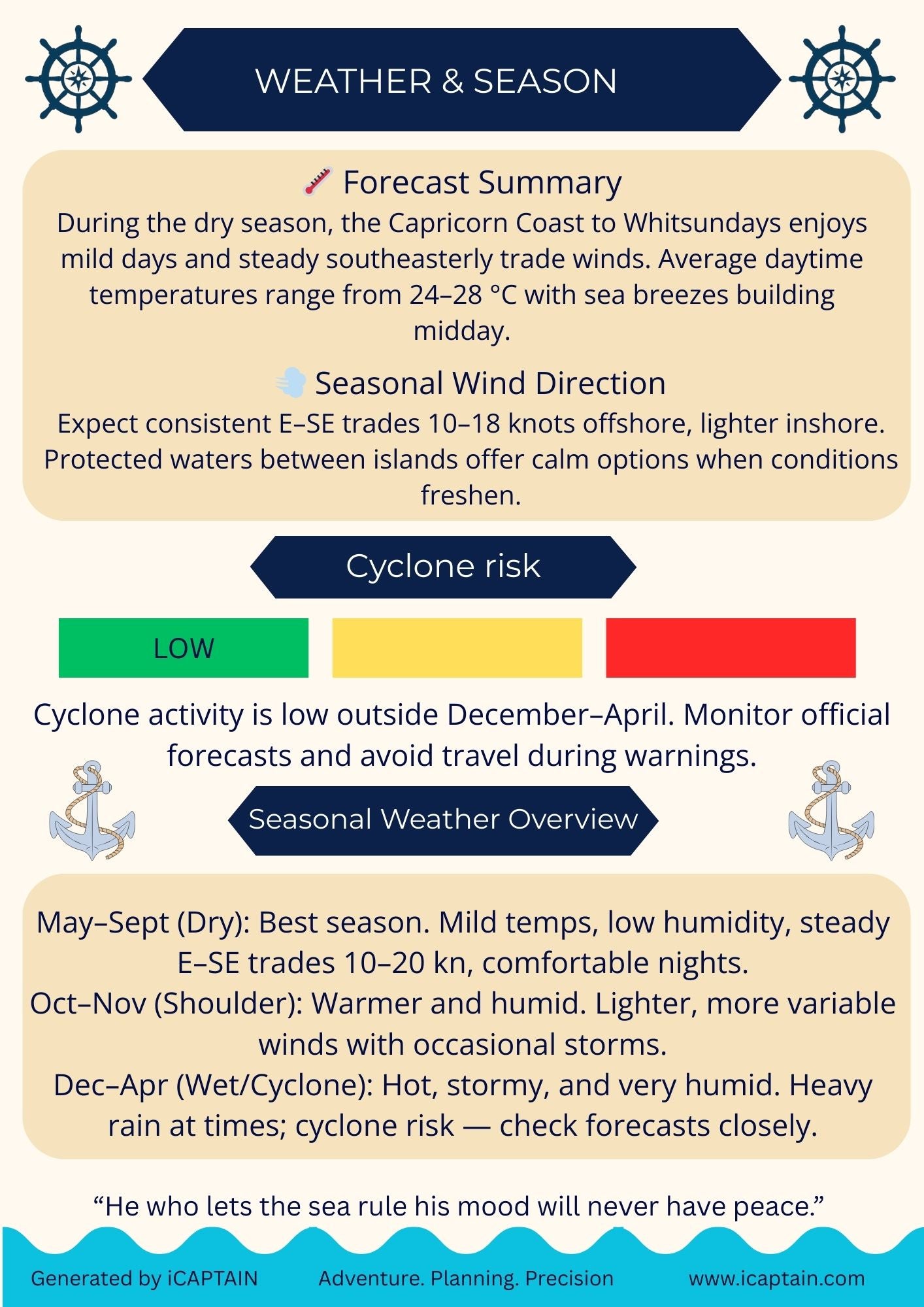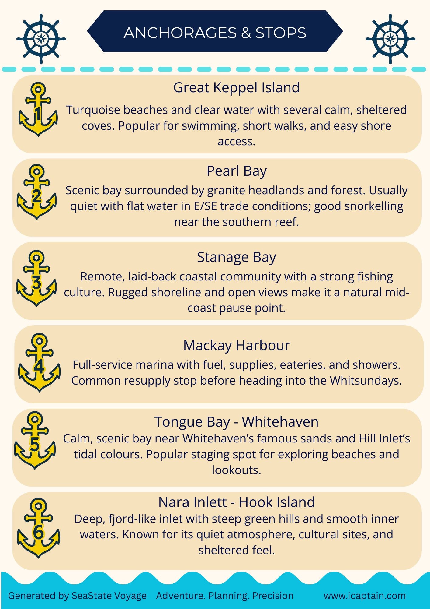 A clear, easy-to-follow 12-page guide covering the full trip from Yeppoon to the Whitsundays.Routes - Anchorages - Weather Notes- Hazards - Checklists - Fuel & Timing-Tips & Local Insights -Charts & Visuals